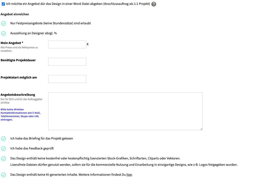 Um die Projektabwicklung zu vereinfachen, hat der Auftraggeber die Möglichkeit, bei Projektstart optional die Abgabe von Angeboten seitens der Designer freizuschalten.