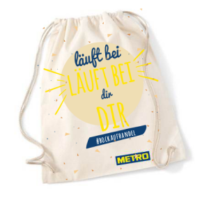 Der Beutel sollte das aktuelle Firmenlogo sichtbar tragen, aber dennoch optisch für die junge Zielgruppe ansprechend sein, so dass er regelmäßig genutzt wird. Gern konnte das Design einen grafischen Aufdruck beinhalten oder einen witzigen Spruch, der mit Arbeiten bei Metro zusammenhängt.