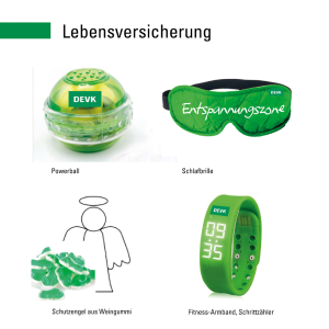 Gesucht wurde eine ideenreiche Vorstellung von Werbeartikeln für unterschiedliche Versicherungsarten, z.B. für eine KFZ- oder eine Unfall-Versicherung.